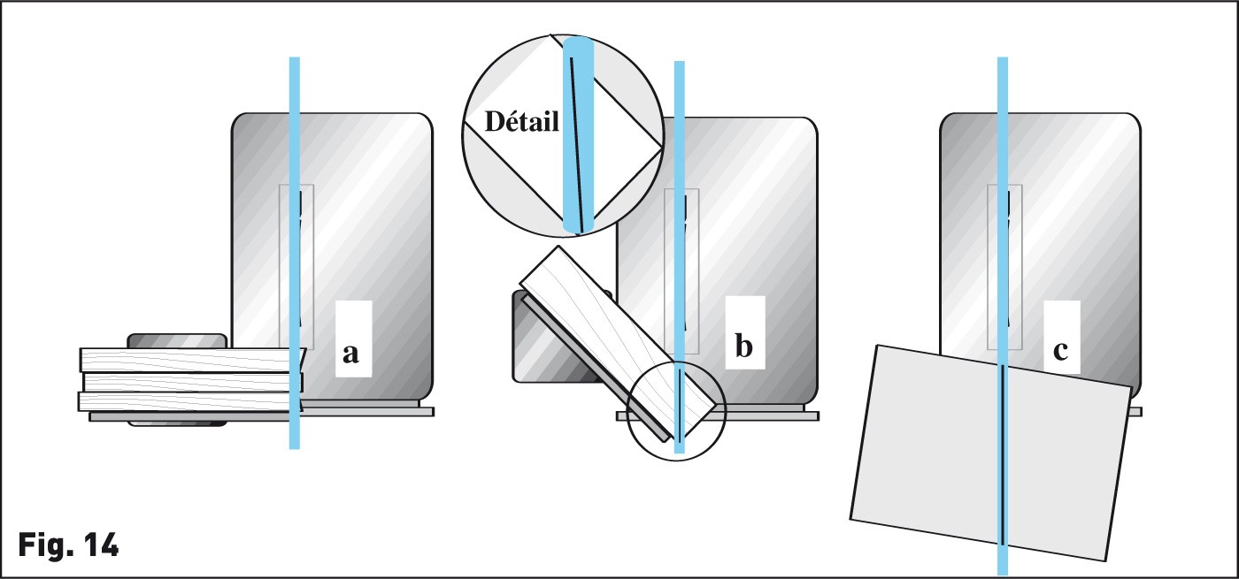 b - les coupes sous tous les angles sont possibles d'après le tracé lui-même, avec un contrôle visuel permanent du bon positionnement de la pièce. Les coupes répétitives sur chariot, que l'on effectuait auparavant en « aveugle » ou plus exactement en faisant confiance aux accessoires de la machine, sont désormais confirmées par la ligne rouge. Le moindre décalage angulaire ou sur la longueur (bois cintré, mal calé, etc.) est tout de suite identifié.