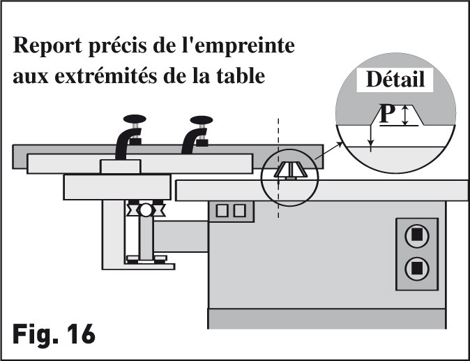 Avec notre ligne laser, qui permet de travailler très précisément d'après tracé, l'affaire est conclue. Encore faut-il, une fois la profondeur P de l'empreinte d'usinage déterminée après passes d'essai (réglage en hauteur de l'arbre), reporter précisément la trace d'usinage sur les extrémités de la table (Fig. 16) comme nous l'avions fait pour la scie circulaire. Les repères ne seront pas gravés cette fois sur la table, mais sur des étiquettes autocollantes puisqu'ils ne sont valides que le temps d'une réalisation ponctuelle.