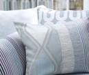 Vue détaillée sur les coussins décoratifs qui habillent le canapé de ce salon.