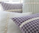 Quatre coussins de couleur pâle ainsi que des rayures ou carreaux blancs plus ou moins épais.