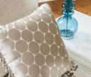 Coussins composés de motif floral et circulaire sur tissu à rayures. La lampe en verre transparent bleu apporte de la couleur.