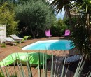 Piscine de forme plus ou moins carré entourée d'une terrasse en lames de bois, de transats et de poufs colorés. Les plantes extérieures permettent une certaine intimité.