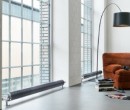 Salon classique avec peu de décoration afin de mettre un élément précis en valeur: les radiateurs de forme ronde. Ils sont placés juste en bas des grandes fenêtres. Une lampe design et un canapé en tissu ornent le tout. Crédit photo : Zehnder Group France