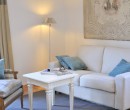 Chambre décorée de manière très classique lui donnant ainsi pureté et légèreté. Canapé en tissu blanc et coussins décoratifs en velours