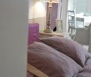 Chambre avec un lit deux places et sa tête de lit en tissu violet, un petit bureau en bois blanc et quelques fauteuils anciens.