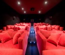 Boudoir recouvert de noir du sol au plafond avec tout de même des spots encastrés au sol et au plafond qui illumine l'intérieur. La seule décoration est composée de nombreux fauteuils rouges en tissu.