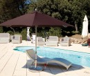 Parasol droit avec pied en métal. Il protège un transat gris design et est placé à côté de la piscine rectangulaire. La surface de protection est limitée. © MMMJ
