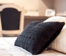 Disposition de coussin noir et blanc composé d'une façade en dentelle. Au second plan se trouve une chaise en cuir noir de style Louis XV.