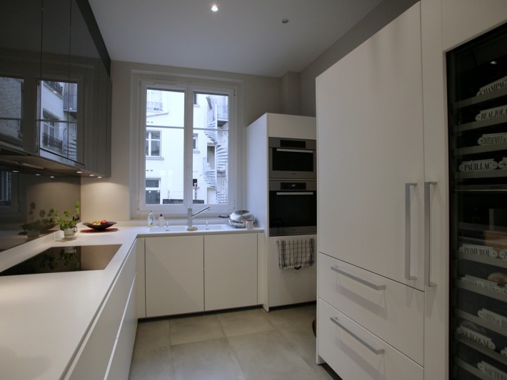 Grand meuble de rangement de cuisine blanc. Il se coordonne parfaitement avec le reste des rangements blanc et gris laqué.