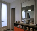 Rangements marron et orange, grand miroir, spots lumineux et carrelage design subliment parfaitement ce décor.