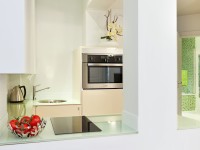 Coin cuisine avec placards et tiroirs blancs. Parquet flottant stratifié dans le salon et la cuisine.