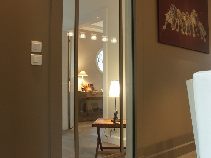 Salle à manger donnant vue sur la partie du salon grâce à un mur en verre intérieur. Petite table d'appoint en bois.