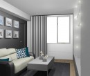 Salon dans les tons blancs et gris. Canapé deux places blanc et table basse rectangulaire grise.