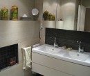 Double lavabo encastré dans un meuble de salle de bain suspendu avec deux tiroirs pousse-lâche. La crédence effet ardoise permet de protéger le miroir et de faire ressortir le mobilier.
