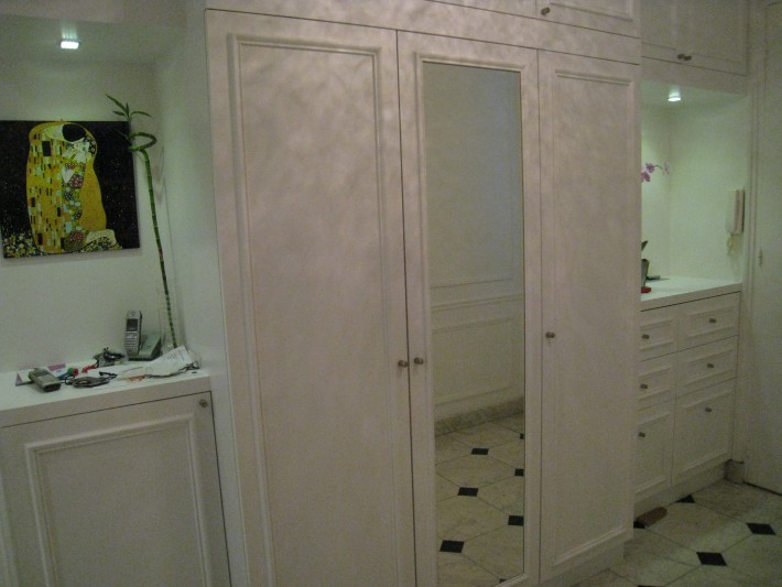 De part et d’autre de la cheminée, il fallait exploiter le retrait et intégrer tout le matériel lié à la télévision et aux ordinateurs. Le secrétaire en position fermé dissimule les deux ordinateurs portables de la famille. Les niches centrales mettent en valeur des sculptures bien éclairées par des leds. Pour créer une ambiance particulière, les étagères sont elles aussi lumineuses. Les meubles sont volontairement assymétriques : d’un côté, c’est la verticalité qui est mis en avant par un caisson rouge remplis de jolis objets mis en lumière et de l’autre côté l’horizontalité est défini par la secrétaire rouge également. Les autres meubles sont en mélaminé imitation béton, qui donne un côté contemporain dans un appartement haussmanien. L’organisation de ce meuble a permis aux propriétaires de trouver une place pour chaque chose. Les étagères pour la bibliothèque ont été calibrées selon le type de livres ou CD à intégrer. Le placard du bas avec les portes contient les nombreuses bandes dessinées de toute la famille. Un éclairage leds vient finaliser ce meuble. La petit déserte, permet d’entreposer quelques objets décoratifs.