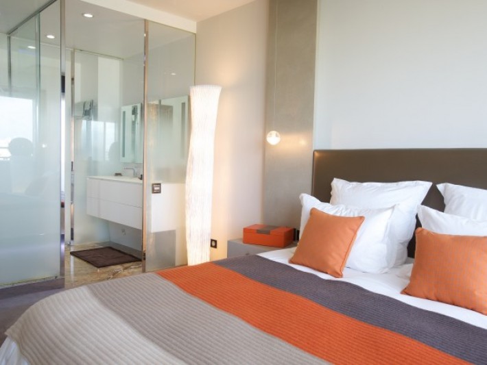 Cette chambre à coucher donne un accès direct à la salle de bain, cette pièce est en accord avec l'ambiance globale de l'appartement grâce aux codes couleurs utilisés dans chacunes des pièces de l'appartement