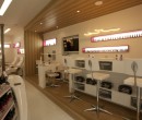 Vue sur l'ensemble de l'espace manucure pour mains et pour pieds. Plusieurs présentoirs des différents vernis sont encastrés aux murs et éclairés. Le sol est recouvert d'un carrelage blanc brillant et d'un parquet en bois clair.