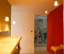 Table haute en bois avec pied en fer et crédence en métal. Tabourets de bar en bois et lampes suspendues au dessus de la table.