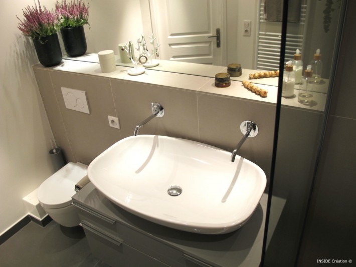 Grande vasque blanche avec deux robinets posée sur un meuble de rangements - INSIDE Création