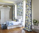 Chambre aux décors muraux classique. Les objets décoratifs qui accompagnent cette pièce donnent une impression de grandeur, de chic. Les rideaux floraux apportent de l'originalité à cette pièce. Ces mêmes motifs se retrouvent sur certains coussins.