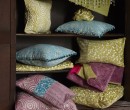 Coussins décoratifs rangés dans une bibliothèque ancienne.