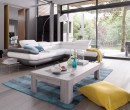Salon à la fois soft et coloré. Le mélange des couleurs bleu et jaune s'accorde parfaitement car elle son en petite quantité et permet de mettre l'accent sur le somptueux canapé en cuir blanc et gris. Les grandes baies vitrées apportent de la luminosité à