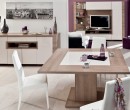 Structure et façade en panneau de particules recouvert de mélaminé imitation chêne. Plateaux de la table et du buffet avec incrustation de mélamine coloris blanc et noisette.