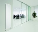 Bureaux dont la séparation entre cle coin travail et le reste de cet intérieur est faite grâce à des baies vitrées coulissantes. On remarque un grand radiateur fin et mural de couleur blanche qui se fond dans le décor. Crédit photo : Zehnder Group France
