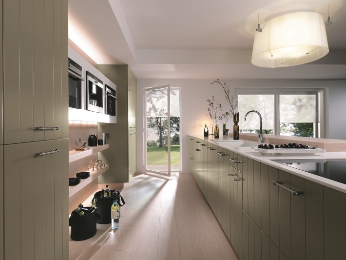 Les façades laquées avec effet de lames verticales : clin d'œil au lambris traditionnel réinterprété. ©Studio SEMAPHORE - Styliste : Martine MOREL