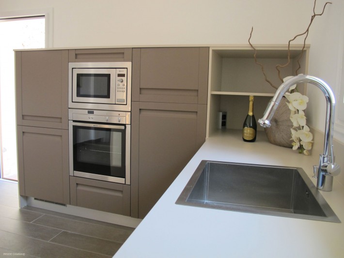 Cuisine équipée avec électroménager encastré et de fonctionnelle avec de nombreux rangements.