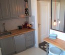 Entre les meubles de rangement se trouve une crédence à fond blanc composée de forme géométrique. Quelques objets décoratifs harmonisent le tout tels que une théière, une ancienne station de radio ...