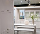 Vue sur un meuble de rangement composé de grande porte de placard. Toujours au centre se trouve la table à manger assortie au plan de travail. Les placards encastrés à la cuisine sont composés d'une porte en verre.