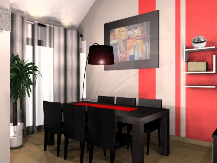 Un mélange de couleurs chaleureuses associées à une décoration et ces éléments moderne, notre objectif lors de notre intervention dans cette maison était de donner à cet intérieur une ambiance chaleureuse avec un jeu de peinture. Dans la partie salon nous optons pour des nuances de chocolat et de beige clair qui mettent en avant une peinture blanche satinée apportant lumière à l'ensemble de l'espace. Le mobilier du salon sont entièrement à revoir avec notre architecte d'intérieur alors nous choisissons un canapé deux places ainsi que sa méridienne pour l'esprit convivial que l'on doit donner à la pièce. Nous sélectionnons plusieurs nuances et ce sont nos clients qui font leur choix. Nous prévoyons également une table basse ainsi qu'un meuble TV à rangements afin de camoufler un maximum d'éléments (courriers, magazines, télécommandes...). La laque blanche semble être la matière la plus adéquate pour ce que nous souhaitons créer, nous proposons également une bibliothèque sur mesure aux niches atypiques. La lampe à abat-jour blanc et sur pied en acier se loge à gauche du canapé permettant ainsi de fermer l'espace salon subtilement. Dans la partie salle à manger l'ensemble du mobilier est conservé, représentant bien l'ambiance moderne et contemporaine. Les tons beige clair sont également appliqués dans cet espace mais associés cette fois à des nuances de rouge en bandes afin de mettre en valeur la hauteur sous plafond assez importante de la maison de notre client. Un jeu d'étagères en laque blanche est placé sur la bande de couleur rouge dans l'optique de créer une sensation de relief!