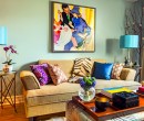 Salon meublé d'un canapé en tissu velour, de nombreux coussins donnent de la couleur et de la singularité à cette pièce. Les lampes avec les abats-jours bleues rappellent les couleurs dominantes de l'appartement et illumine la pièce.