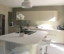 Cuisine en laque mate sans poignée avec une partie en îlot intégrant une plaque induction multi-zone et une hotte escamotable. Le plan de travail est en quartz légèrement bouchardé. Crédence en carreaux de ciments Mutina de Patricia Urquiola.