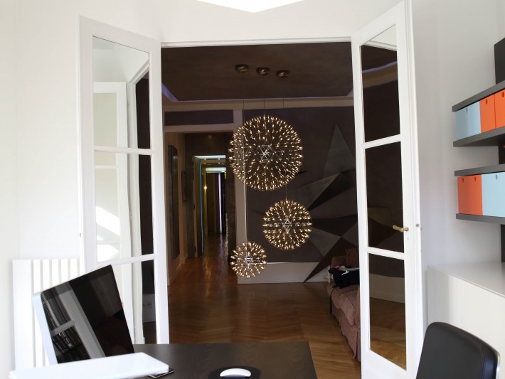 Bureau dont les murs sont blancs. Parquet en bois clair au sol. La chaise de bureau et les suspensions luminaires sont design, ce qui apporte de la modernité et de l'originalité à cet intérieur. Crédit Photo : Clara Mill.