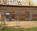 Chantier de construction d'une maison en ossature bois construite par Maison-eco-malin et l'ensembles de ses professionnels proche Lisieux en Normandie. Entièrement réalisée sur mesure selon les besoins de notre client, cette maison est construite sur vide-sanitaire avec bardage naturel en Reed-cedar ou cèdre rouge, le couverture et en ardoises les gouttières en zinc et les menuiserie en alu noir avec volets électriques intégrés.