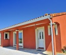 Maison de plain pied peinte de couleur ocre. Vue sur l'entrée couverte et ombragée.