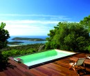 Piscine extérieure de forme rectangulaire entourée d'une terrasse en lame de bois ciré et de transats.
