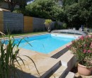 Piscine de modèle Krypronite et de forme rectangulaire. Elle possède un abri dépliable et est entourée d'une terrasse en hauteur composée de carrelage beige.