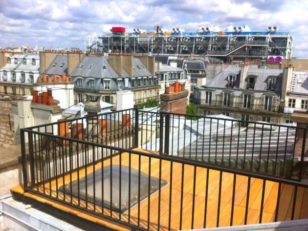 Dans ce projet, l'agence Rénovation Parisienne a donner une nouvelle vie à cette terrasse parisienne. C'est un espace ayant une vue privilégiée sur le Centre national d'art et de culture Georges-Pompidou. Terrasse qui mixe bois et fer forgé lui donnant ainsi légèreté et créativité.