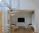 Salon moderne avec deux sièges design et un escalier aéré en aluminium et en verre.