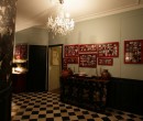 Suite de l'entrée noir et blanche avec lustre design. On aperçoit l'entrée vers la chambre. Les murs sont recouverts de cadres rouges sous lesquels sont placés des meubles à motifs.
