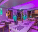 Salle de restaurant design avec lumières violettes et vertes.