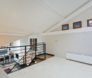 Espace d'aménagement au premier étage ouvert sur le niveau inférieur. Les rampes de l'escalier sont en acier. Un radiateur électrique ainsi que des cadres en bois ornent ce décor.