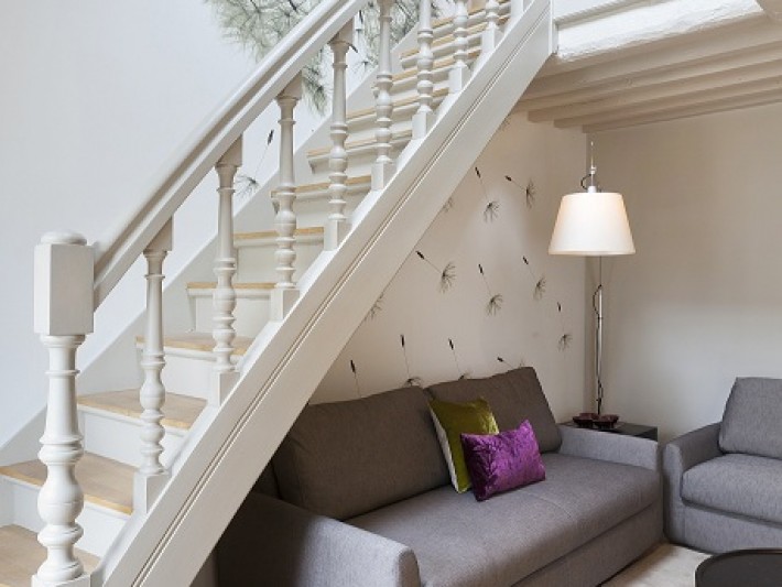 Salon au style contemporain et épuré. Le mur est décoré d'une touche végétale qui se retrouve en hauteur au niveau de l'escalier. Canapé deux places gris en tissu et lampadaire blanc et en métal.