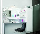 Vue sur le coin coiffeuse composé d'une chaise en plastique noir, d'un petit meuble de rangement assortie avec la table, tout deux de couleurs blanches. Un miroir design ainsi que des suspensions lumineuses type industrielle ornent le tout.