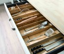 Tiroir de rangement pour accessoires de cuisine avec séparation. L'intérieur de ce tiroir est en bois alors que l'extérieur est de couleur blanche brillante. Le plan de travail est composé de bois clair.