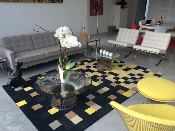 Ce salon imaginés et dessinés par nos architectes donne un cachet à cet espace qui regroupe le salon et la salle à manger, grâce aux couleurs utilisées, comme le jaune le marron, le beige et le noir, qui donne un côté contemporain dans un univers design