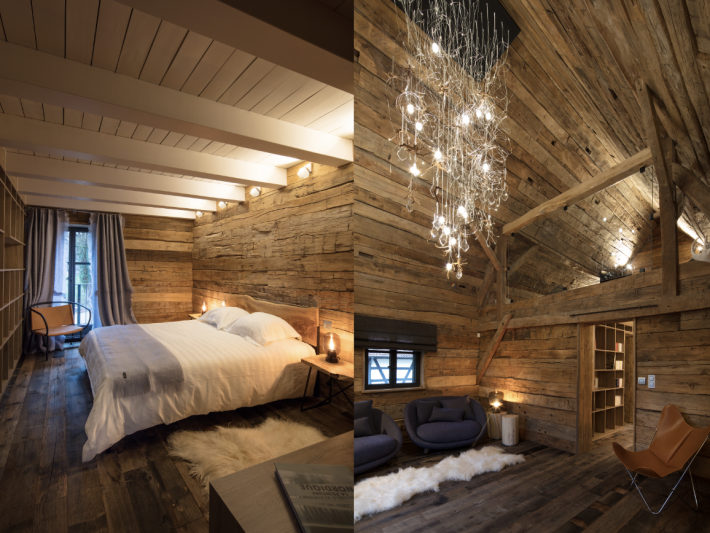 Une grange transformée en chalet, du bois brut aux essences alpines, un lustre de verre comme une cascade neigeuse, tout est réuni pour une ambiance cocooning.